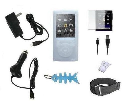 Product Description : 8 Items Accessory Combo Kit for Sony Walkman E Series Walkman (NWZ-E353 & NWZ-E354): Includes Clear/White Silicone Case, Armband, Belt Clip, LCD Screen Protector, Wall Charger, Car Charger, 2in1 USB Data Cable and Light Blue Fishbone Style Keychain